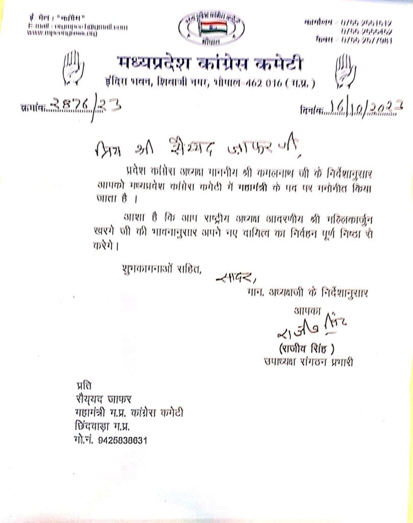 मध्यप्रदेश में आगामी विधानसभा चुनाव के पहले कांग्रेस संगठन में बड़ा बदलाव देखने को मिला है। पूर्व मुख्यमंत्री कमलनाथ ने कांग्रेस नेता सैय्यद जाफर को मध्यप्रदेश कांग्रेस कमेटी का महामंत्री मनोनीत किया है। इसे लेकर नियुक्ति आदेश भी जारी कर दिया गया है।