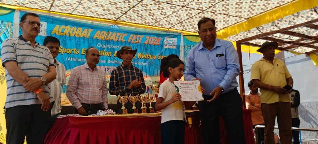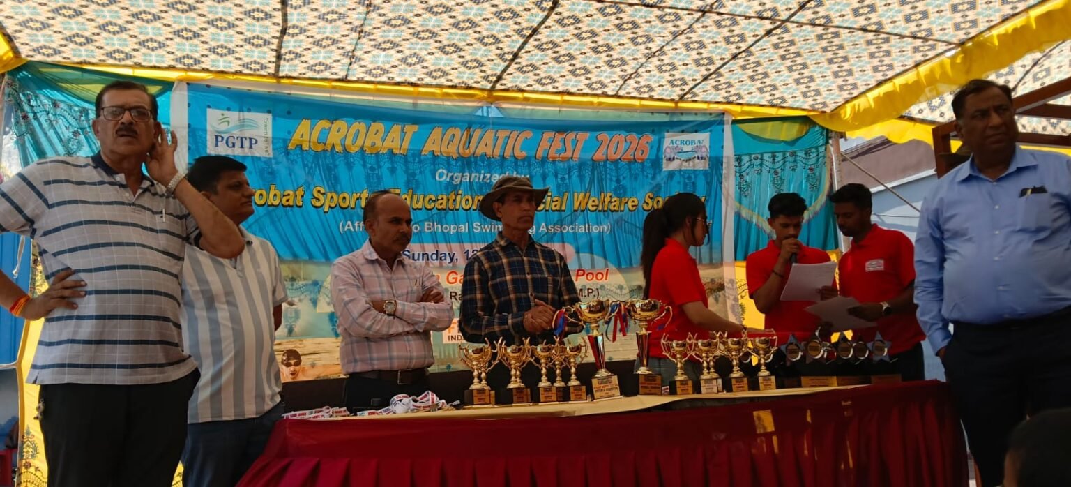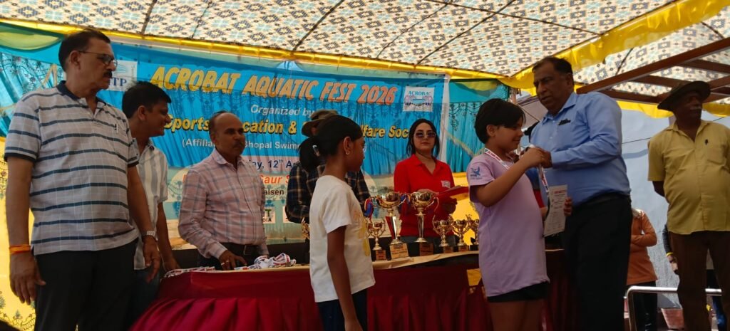 भोपाल। रायसेन रोड कल्पना नगर के कोल परिसर स्थित पुरुषोत्तम गौर स्विमिंग पूल में 12 अप्रैल को एक्रोबट एक्वाटिक फेस्ट-2026 तैराकी प्रतियोगिता का आयोजन किया गया। आयोजन की शुरुआत बच्चों के रिपोर्टिंग टाइम के साथ हुई। यह आयोजन एक्रोबट स्पोर्ट्स एजुकेशन एंड सोशल वेलफेयर सोसायटी पुरुषोत्तम गौर स्विमिंग पूल द्वारा भोपाल स्विमिंग एसोसिएशन के सहयोग से किया गया है। इसमें सभी आयु वर्ग के प्रतिभागियों के लिए विभिन्न श्रेणियों में प्रतिस्पर्धाएं आयोजित की गई। प्रतियोगिता के समापन पर कोच और समिति पदाधिकारियों ने सभी विजेता प्रतिभागी बच्चों को शील्ड-मेडल ओर प्रशस्ति पत्र देकर सम्मानित किया। इस मौके पर पूल संचालक संतोष कटियार, स्वीमिंग कोच आरडी झा, समाजसेवी उदित नारायण समेत बड़ी संख्या में आयोजन समिति के सदस्य, बच्चे और उनके अभिभावक गण मौजूद रहे।