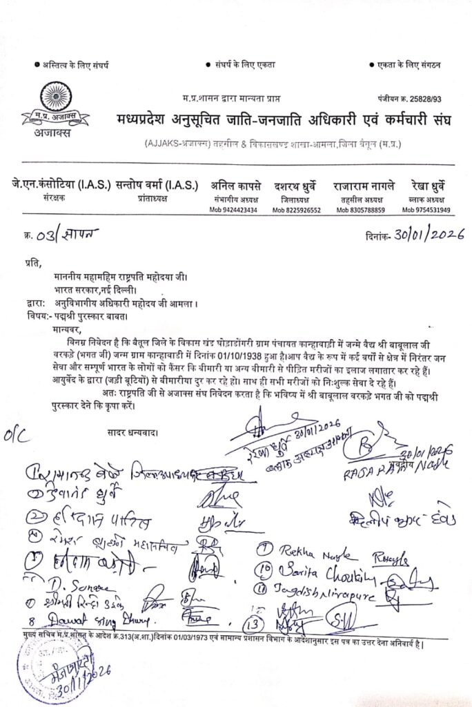 आप वैद्य के रूप में विगत कई वर्षों से क्षेत्र में निरंतर जन सेवा और संपूर्ण भारत के लोगों को कैंसर की बीमारी या अन्य बीमारी से पीड़ित मरीजों का इलाज लगातार कर रहे हैं आयुर्वेद( जड़ी बूटियां) के द्वारा बीमारियां दूर कर रहे हैं साथ ही सभी मरीजों को निशुल्क सेवा दे रहे हैं। अतः राष्ट्रपति से अजाक्स संघ निवेदन करता है कि भविष्य में बाबूलाल वरकडे भगत को पद्मश्री पुरस्कार दिया जावे ज्ञापन सौंपने वालों में मुख्य रूप से अजाक्स तहसील अध्यक्ष आमला राजाराम नागले, अजाक्स ब्लॉक अध्यक्ष आमला श्रीमती रेखा धुर्वे,