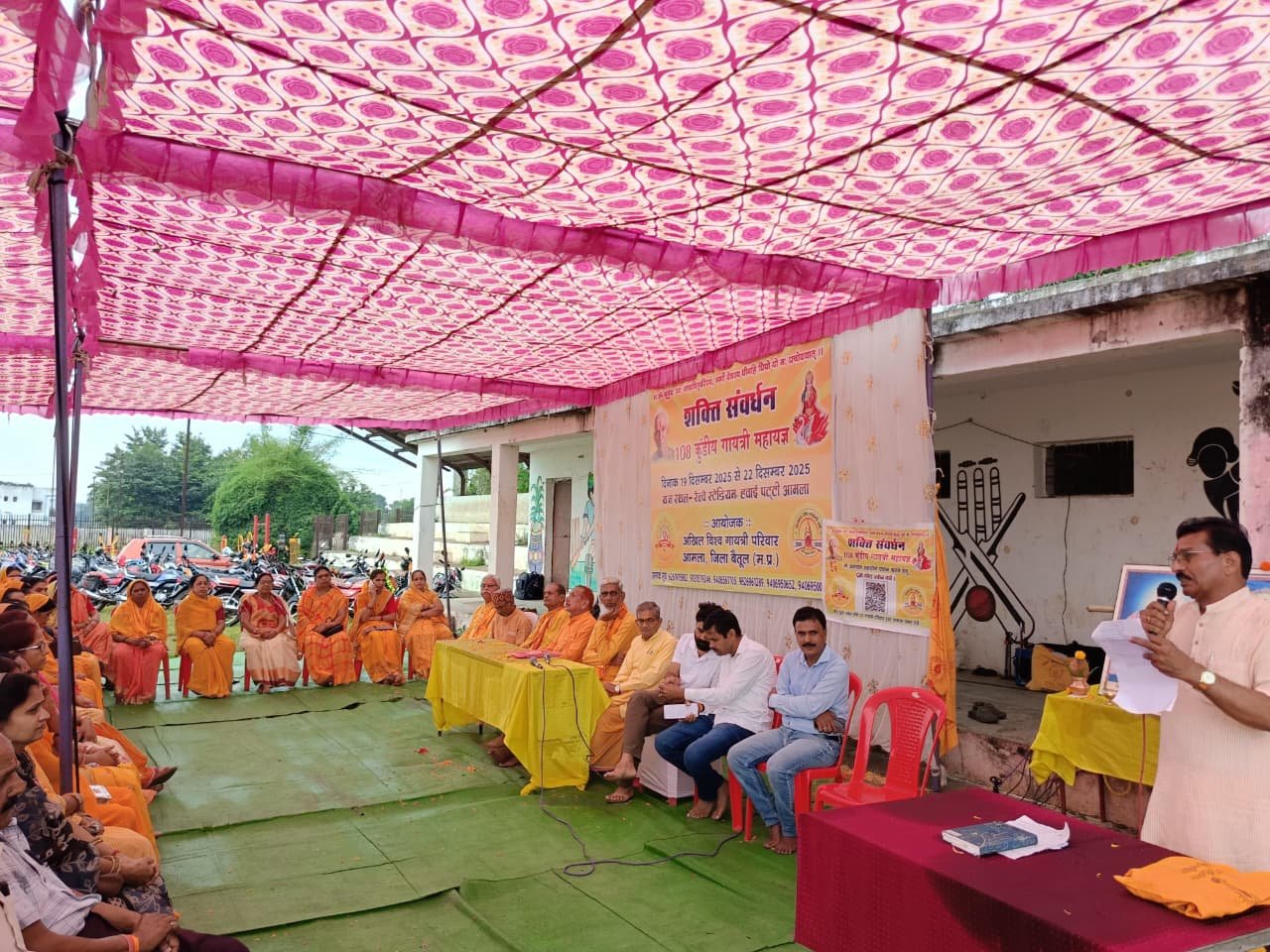 Thousands of family members will perform sadhana and offer more than twenty-four tonnes of sacrifices. हरिप्रसाद गोहेआमला । आमला के रेलवे स्टेडियम में आगामी 19 से 22 दिसंबर तक आयोजित होने वाले 108 कुण्डीय गायत्री महायज्ञ कार्यक्रम की समितियों का निर्धारण करने हेतु आज गोष्ठी संपन्न हुई।आयोजित जिला स्तरीय बैठक में गायत्री परिवार के छिंदवाड़ा उपजोन समन्वयक दिनेश देशमुख एवं जिला समन्वयक डॉ कैलाश वर्मा ने यज्ञ के सफल आयोजन के लिए विभिन्न समितियों को मार्गदर्शन दिया। बैठक में जिले के विभिन्न तहसील के समन्वयक एवं गायत्री परिजन उपस्थित रहे। कार्यक्रम के लिए लगभग 19 समितियों का सर्व सम्मति से निर्माण किया गया। वहीं यज्ञ के लिए उपस्थित लगभग 31 गायत्री परिजनो ने अंशदान का संकल्प लिया। विदित हो कि 108 कुंडी गायत्री यज्ञ में अखिल विश्व गायत्री परिवार शांतिकुंज हरिद्वार से प्रमुख डॉ चिन्मय पंड्या शामिल होंगे। जिला समन्वयक डॉ कैलाश वर्मा ने जिले के सभी गायत्री परिजनों को यज्ञ में सहयोग का आवाहन किया है। यज्ञ शाला निर्माण और अंशदान हेतु पुरे जिले से बढनें लगें सहयोग के हाथ उपजोन समन्‍वयक दिनेश देशमुख ने बताया जरूरत पढ़ी तो बैतूल जिले की सीमाओं से सटें सभी जिलों के परिजन आकर करेंगें श्रमदान ।यज्ञ में श्रम दान करनें के लिए सभी का सहयोग श्रम और सहयोग जरूरी – डॉ कैलाश वर्माडॉ कैलाश वर्मा ने बताया कि अखिल विश्‍व गायत्री परिवार वंदनीय माता भगवती देवी शर्मा एवं अखण्‍ड ज्‍योति की जन्‍मशताब्‍दी पुरे वर्ष मनायेगा उन्‍होने बताया कि जल्‍द ही जन्‍मशताब्‍दी पर्व पर बैतूल जिले से साधकों का जत्‍था जनवरी माह में तीन दिवसीय साधना करनें हरिद्वार पंहुचेगा।