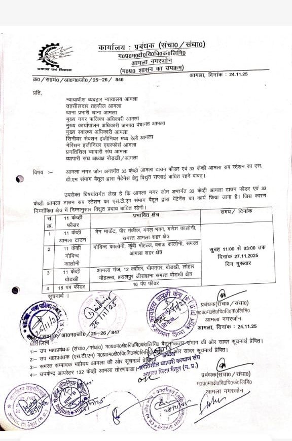 आमला। आमला नगर जोन अंतर्गत 33 केव्ही आमला टाऊन सब स्टेशन का एस.टी.एस संभाग बैतूल द्वारा मेंटेनेंस कार्य किया जाना है। जिस कारण दिनांक 27/11/2025 दिन गुरुवार को संपूर्ण आमला शहर में विद्युत सप्लाई बाधित रहेगी”ए ई मध्यप्रदेश विद्युत वितरण कंपनी आमला विलास उईके से प्राप्त जानकारी अनुसार आमला नगर जोन अंतर्गत 33 के व्ही आमला सब स्टेशन का एस टी एस संभाग बैतूल द्वारा मेंटनेंस कार्य किया जाना है जिस कारण निम्नांकित क्षेत्र में निम्नानुसार विद्युत प्रदाय बाधित रहेंगी।