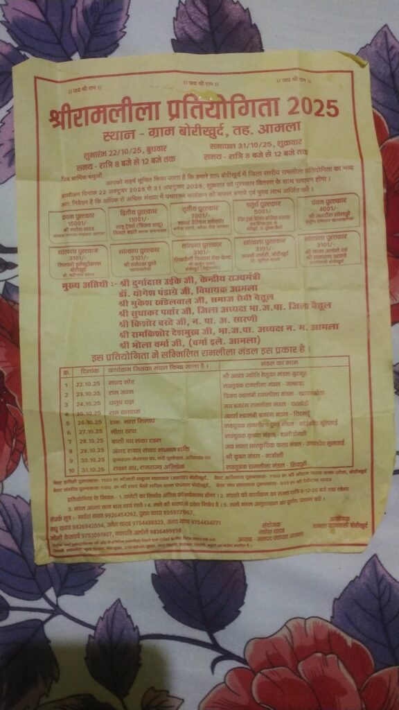 आमला/बोरी खुर्द । रामलीला कलाकारों के उत्साहवर्धन एवं दर्शकों की मांग को दृष्टिगत रख ग्राम बोरी खूर्द में जिला स्तरीय रामलीला प्रतियोगिता का भव्य आयोजन संयोजक गणेश यादव के मार्ग दर्शन व ग्राम वासियों के सहयोग से आयोजित किया जा रहा है। रामलीला प्रतियोगिता का विधिवत् शुभारंभ बुधवार दिनांक 22/10/2025 को किया गया। समापन दिनांक 31/10/2025 को आमंत्रित गयमान्य अतिथियों का हस्ते कलाकारों को पुरस्कार वितरण कर होगा।
