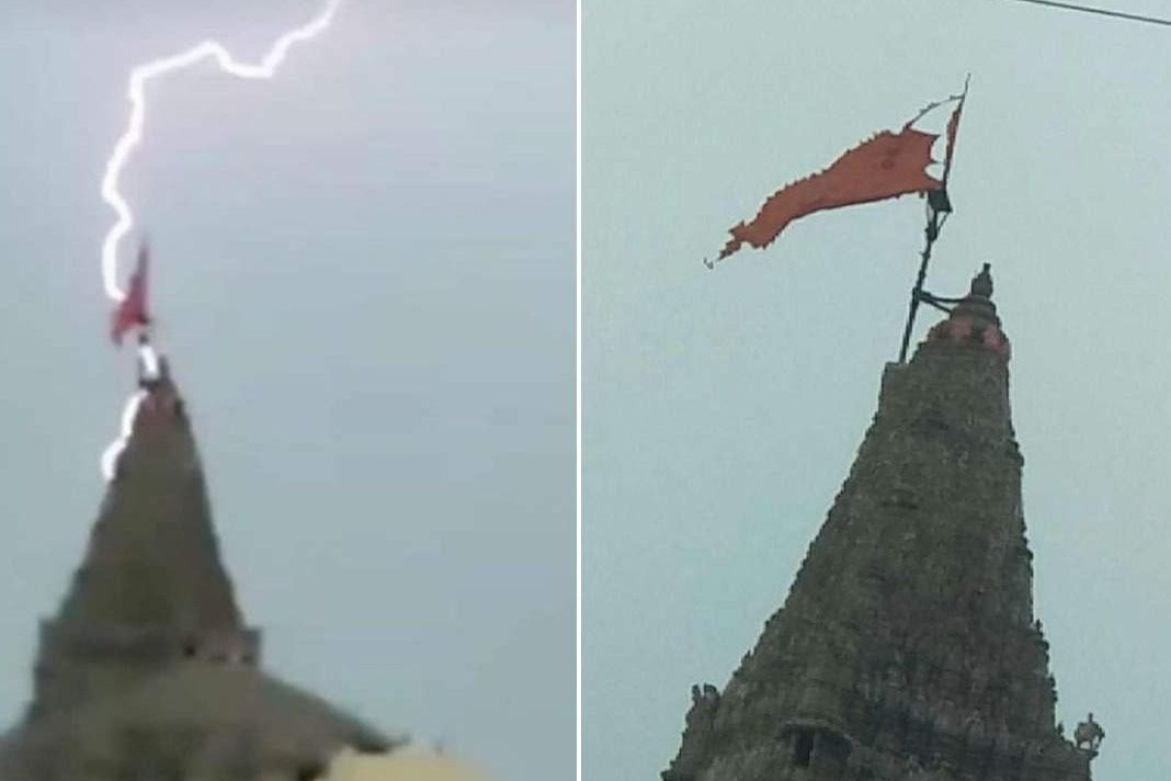 द्वारका। गुजरात के द्वारका ( Dwarka) में मंगलवार को प्रसिद्ध द्वारकाधीश (dwarkadheesh) मंदिर के ध्वज दंड पर बिजली गिर गई। बिजली गिरने से मंदिर की 52 गज ध्वजा को नुकसान पहुंचा। हालांकि, इस हादसे में द्वारकाधीश मंदिर को कोई नुकसान नहीं पहुंचा है और केवल मंदिर की दीवारें काली पड़ गईं। घटना मंगलवार दोपहर 2:30 बजे के लगभग हुई। झंडे पर बिजली गिरने का वीडियो सोशल मीडिया में वायरल हो रहा है। मंदिर के आस-पास घनी बस्ती है। ऐसे में अगर रिहायशी इलाके में बिजली गिरती तो बड़ा नुकसान हो सकता था।