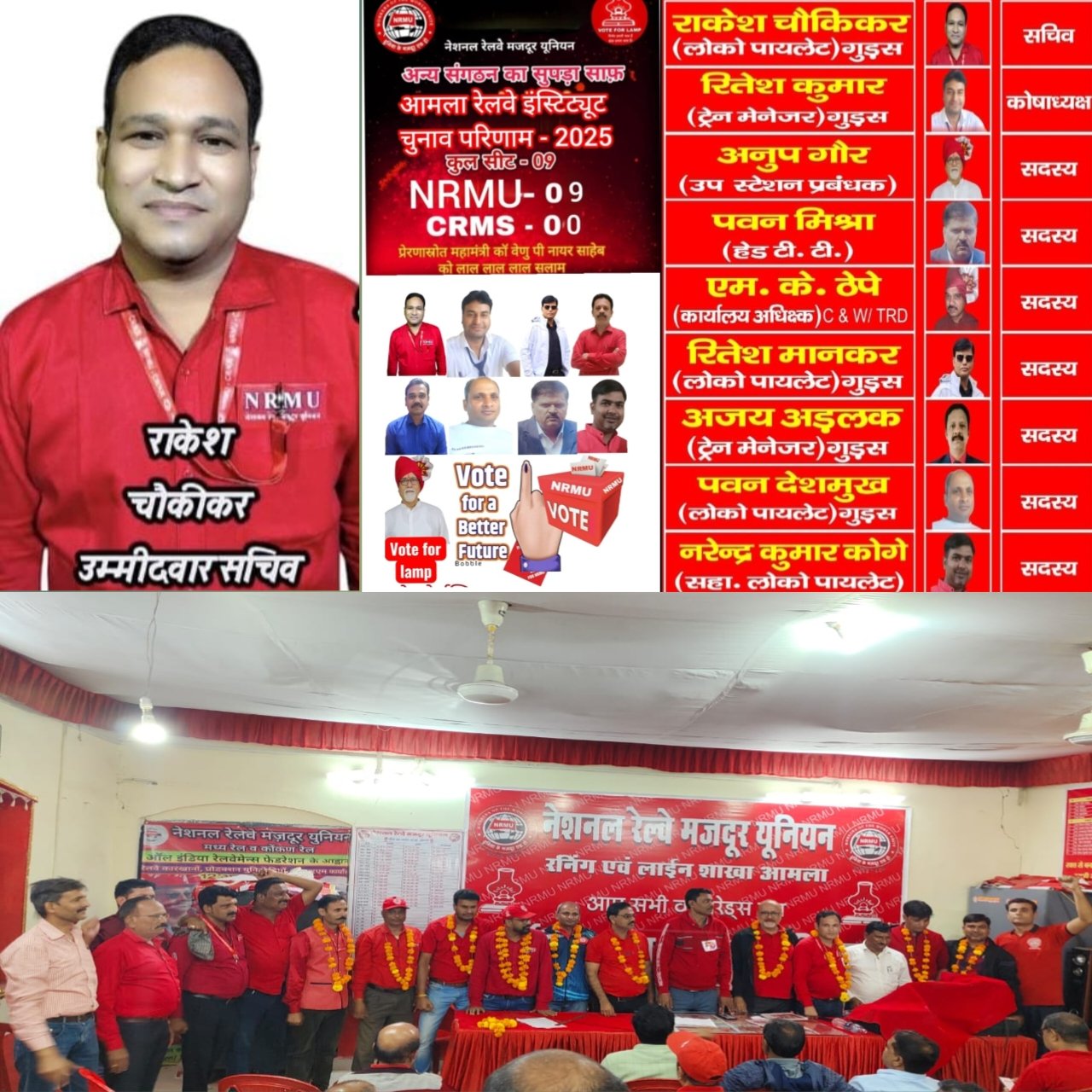 आपको बता दे घोषित चुनाव परिणामों में नेशनल रेल्वे मजदूर यूनियन ने पैनल की सभी (9) सीटे जीतकर इतिहास रच दिया ।इंस्टीट्यूट चुनाव में नेशनल रेलवे मजदूर यूनियन के प्रत्याशियों ने जबरदस्त जीत दर्ज की जिसमें सचिव पद पर राकेश चौकीकर और कोषाध्यक्ष के पद पर रितेश कुमार ने शानदार जीत दर्ज की और लाल सलाम का लाल परचम लहराया।वहीं सदस्य के तौर पर अनूप गौर,एम के ठेपे,पवन मिश्रा,अजय अड़लक,रितेश मानकर,नरेंद्र कुमार कोगे,पवन देशमुख ने शानदार जीत दर्ज की।पैनल वोट में 203 वोट नेशनल रेलवे मजदूर यूनियन पैनल को और 123 पैनल वोट सेंट्रल रेलवे मजदूर संघ को मिले।