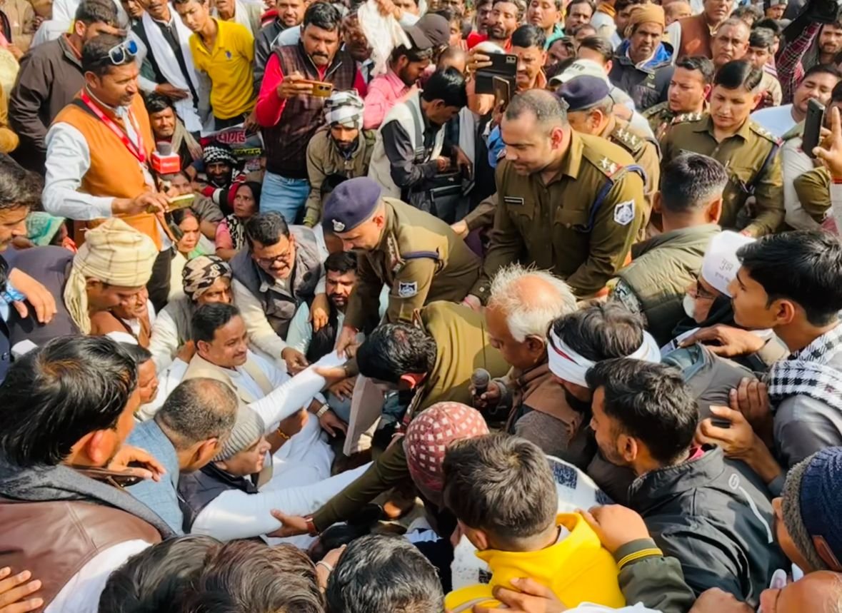 Police arrested MLA Pankaj Upadhyay who was protesting against Kailaras sugar factory auction. 10 thousand farmer youth arrested.
