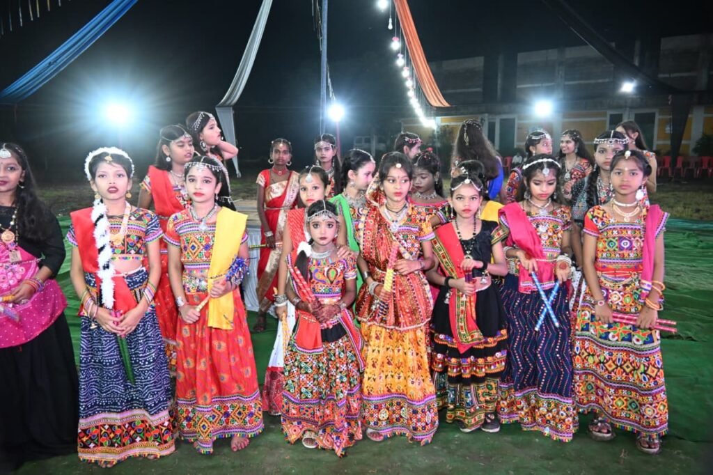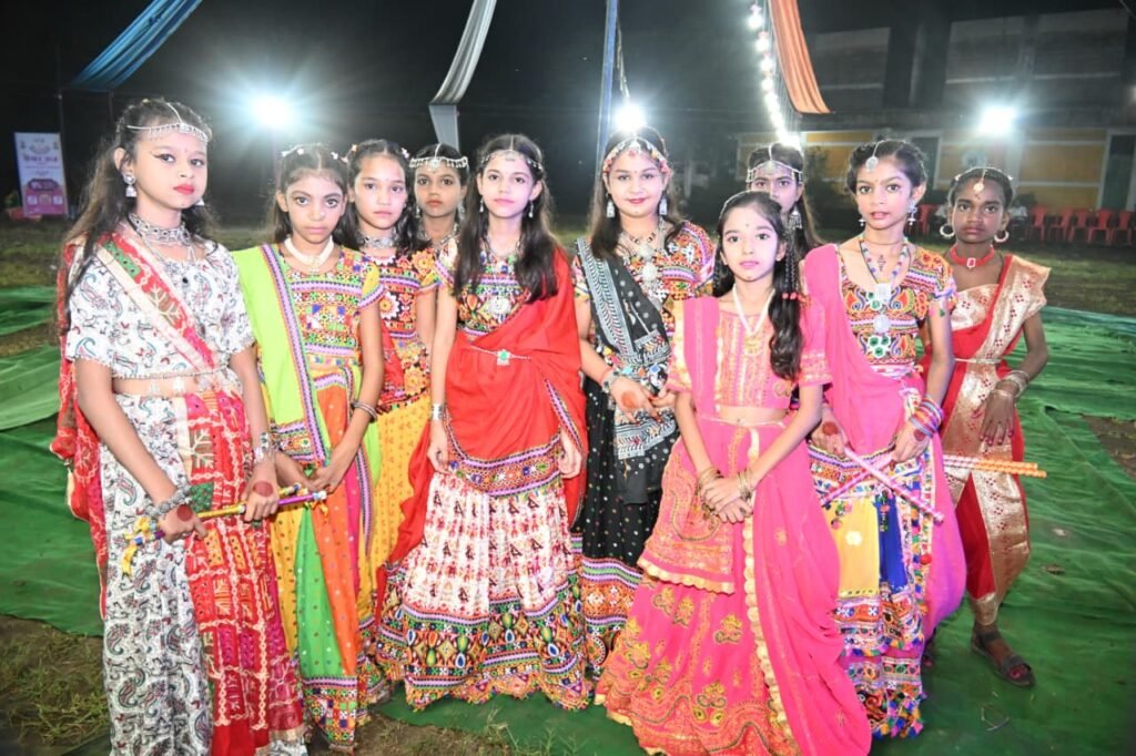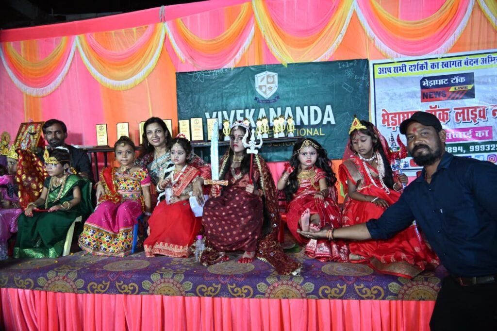 मंच पर नन्हीं बालिकाओं ने नवरात्रि का रूप लेकर उचित वेश भूषा में नव रात्रि का एक अलग ही सौंदर्य पैदा किया दर्शक माताजी के इन सजीव रूपों के साथ बहुत सेल्फी लेते रहे।