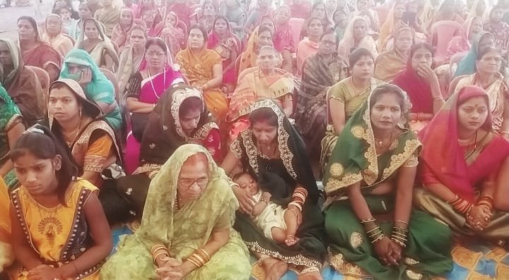 The story is being narrated by Bal Vyas Chaitanya Puri Goswamiji, people are reaching in large numbers.